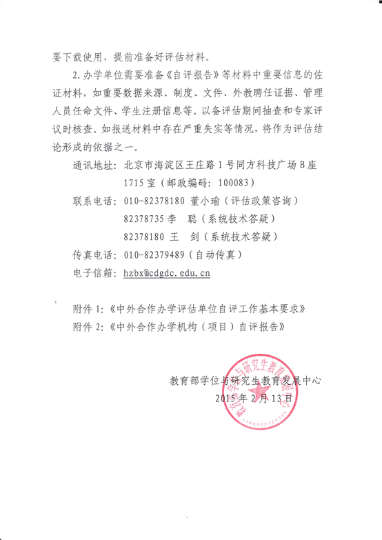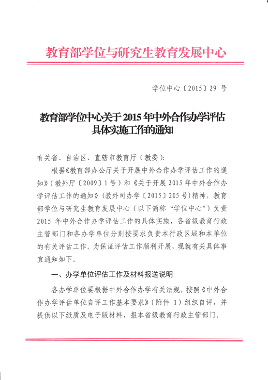 《教育部學(xué)位中心關(guān)于2015年中外合作辦學(xué)評估具體實施工作的通知》(學(xué)位中心[2015]29號)
